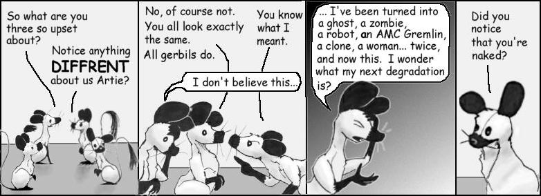 All things considered, it’s pretty surprising that this is the only time the human members of the cast get turned into gerbils. In regular Narbonic continuity, it’s more likely for the gerbil members of the cast to get turned into humans.