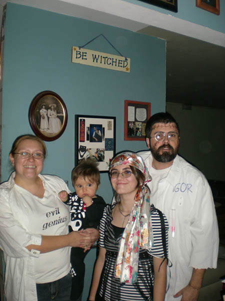 The group of pictures is of my wife, our two younger daughters and myself last Halloween. Mary chose (on October 30th) to embrace her inner Mad Scientist, inspired by the pink hearted Evil of Narbonic.