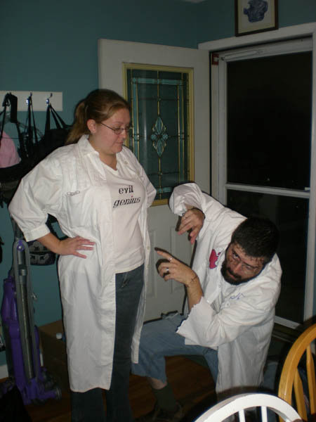 As it was much to late to purchase an actual “Evil” t-shirt, a quick run to Goodwill and Walmart (oooh, TRUE evil) supplied us with two lab coats, a white t-shirt, and laser printer iron-on sheets. Wanting the Narbonic vibe without totally ripping you off, we went with the “Evil Genius” from “Lilo & Stitch” with Narbonic heart dots.